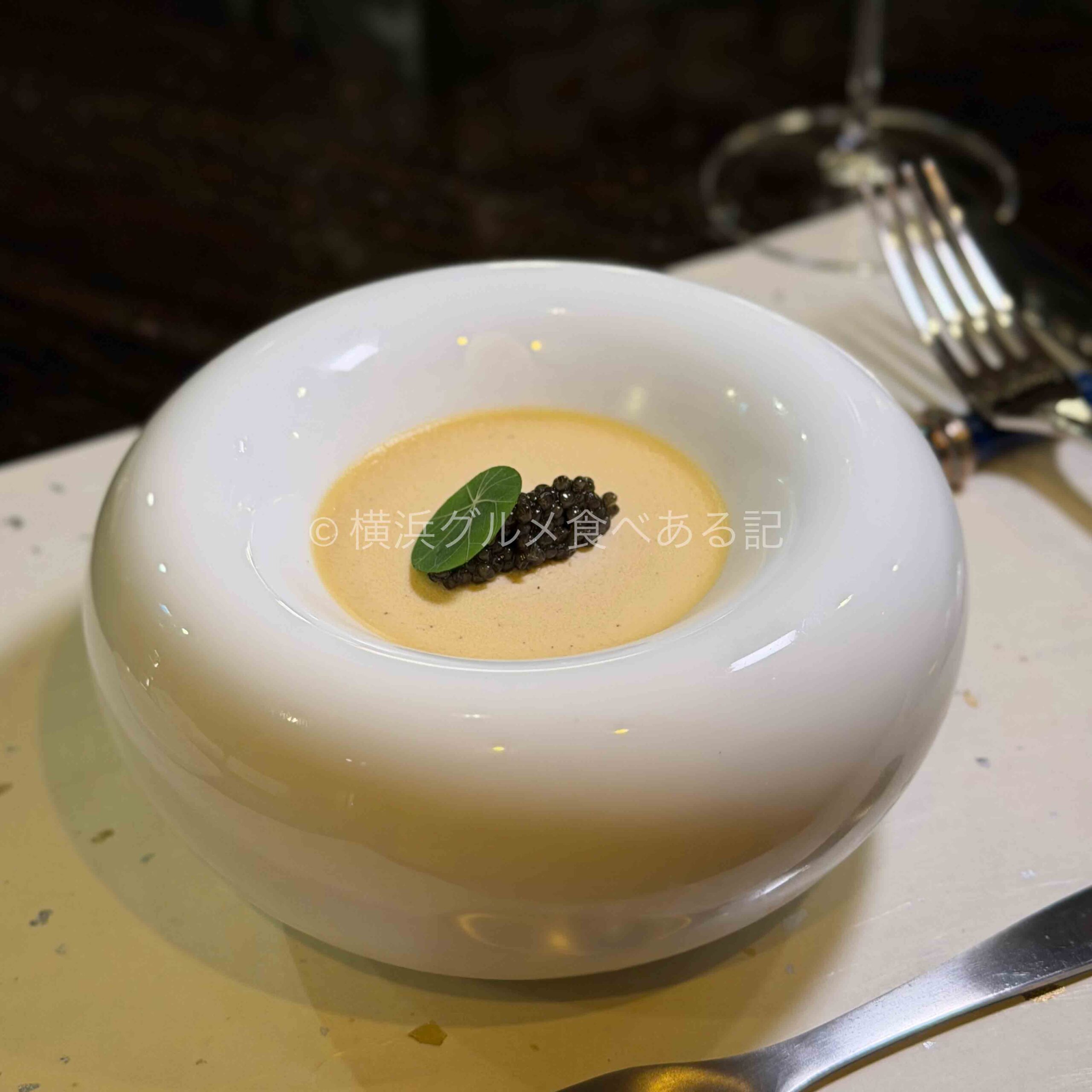 オシェトラキャビア×ジビエのコンソメフランは、素材の輪郭を際立たせる逸品。