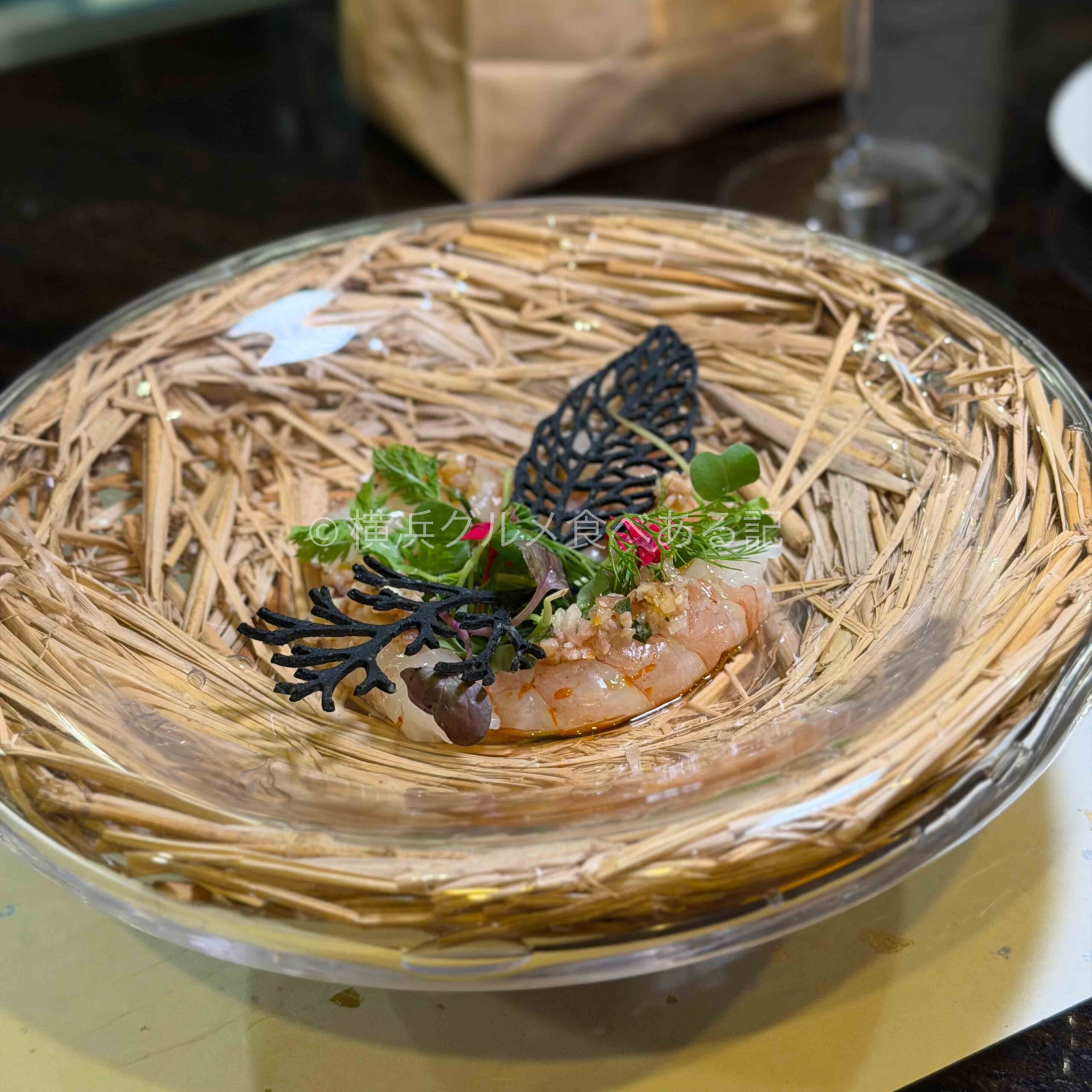 続く一皿は、赤海老と栗の香りが重なる“ガーデニング”仕立てで、美しさと香りが一気に広がります。