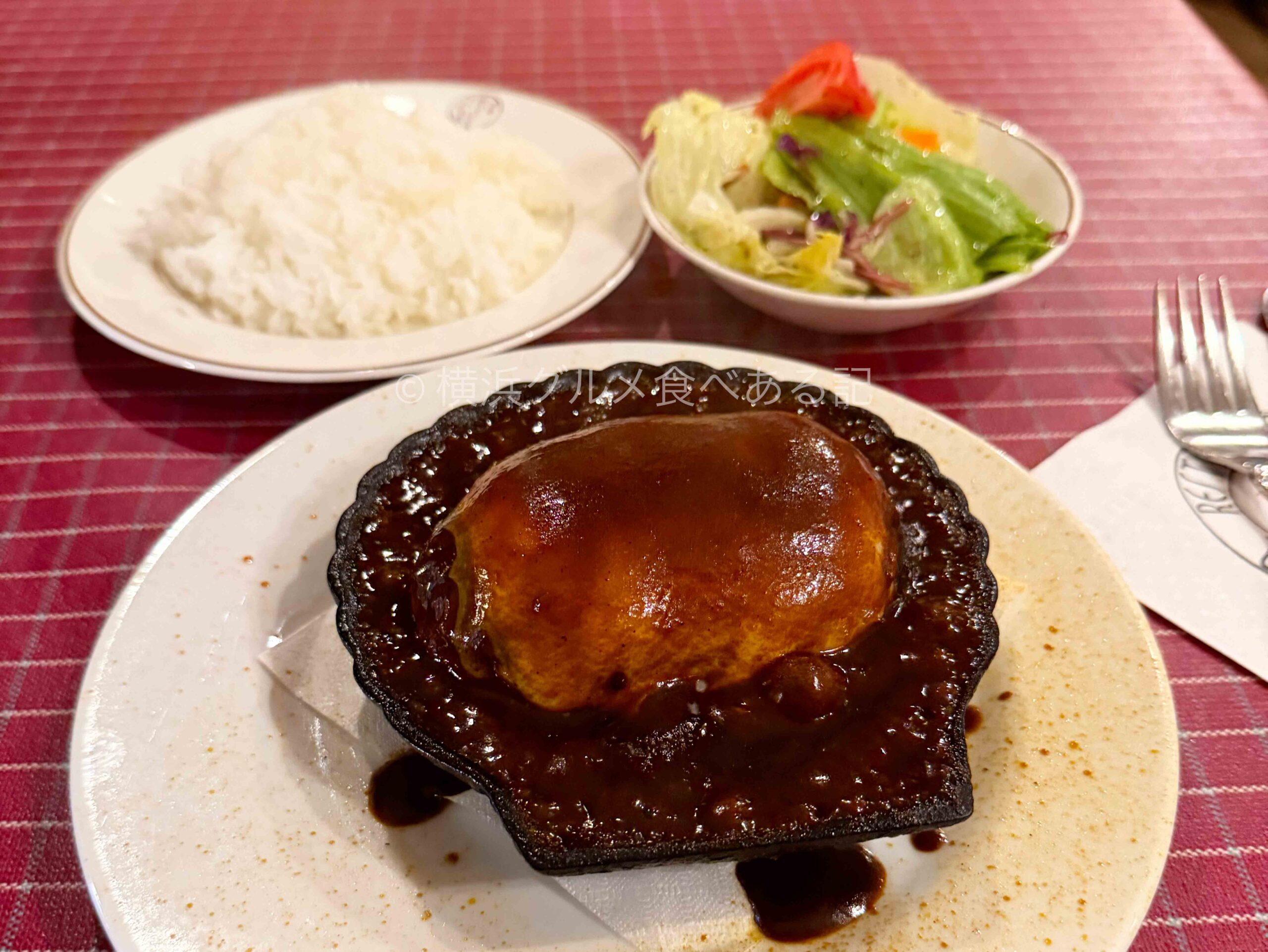 正式なメニュー名は「ハンバーグ 日本風」で門外不出、秘伝のレシピで作った自家製ソースは唯一無二とのこと。