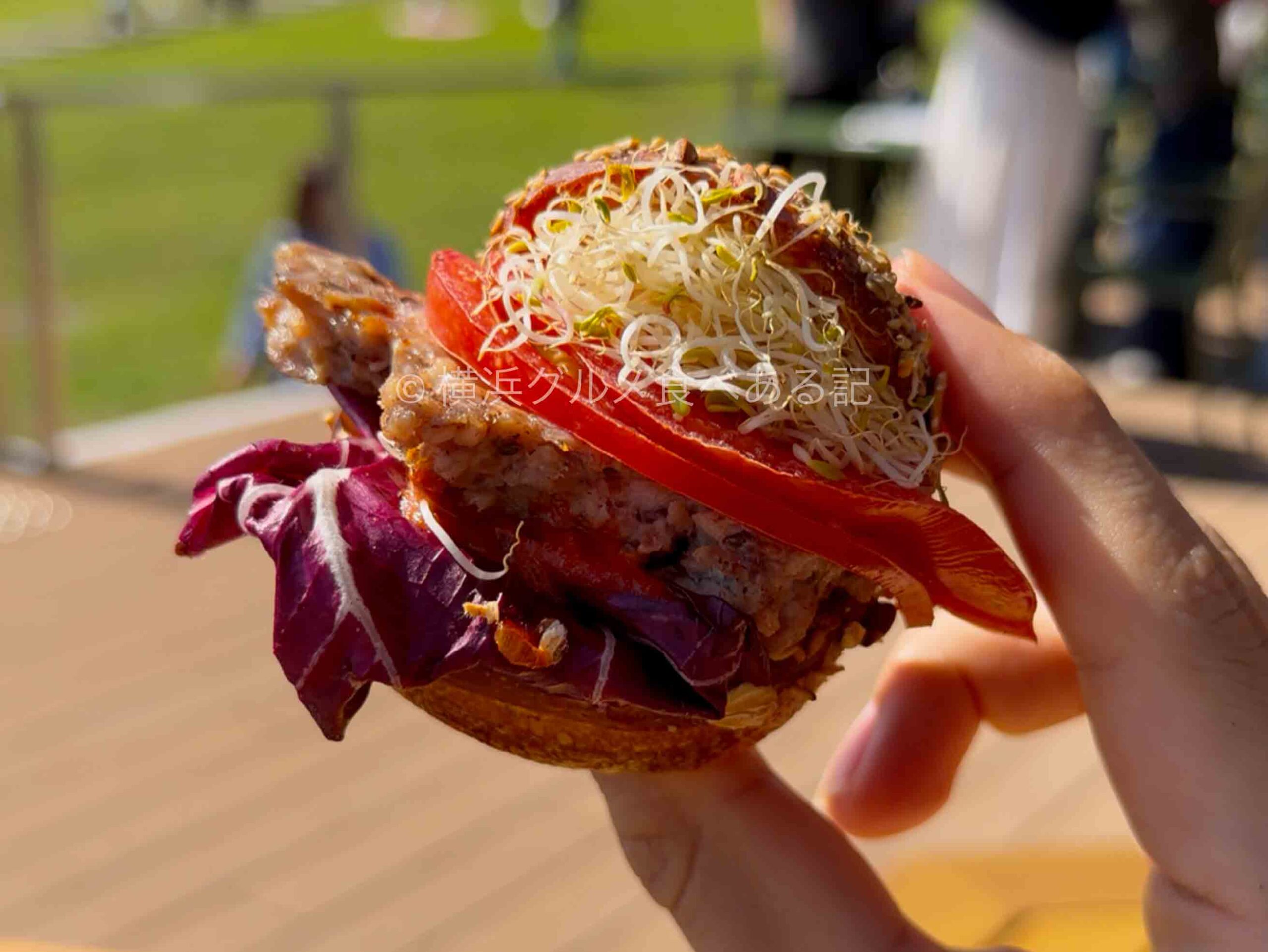 定番の「ダコーバーガー」です。スパイスがほんのり効いたサルシッチャとトレビス、トマトなどが入ったプチバーガー。