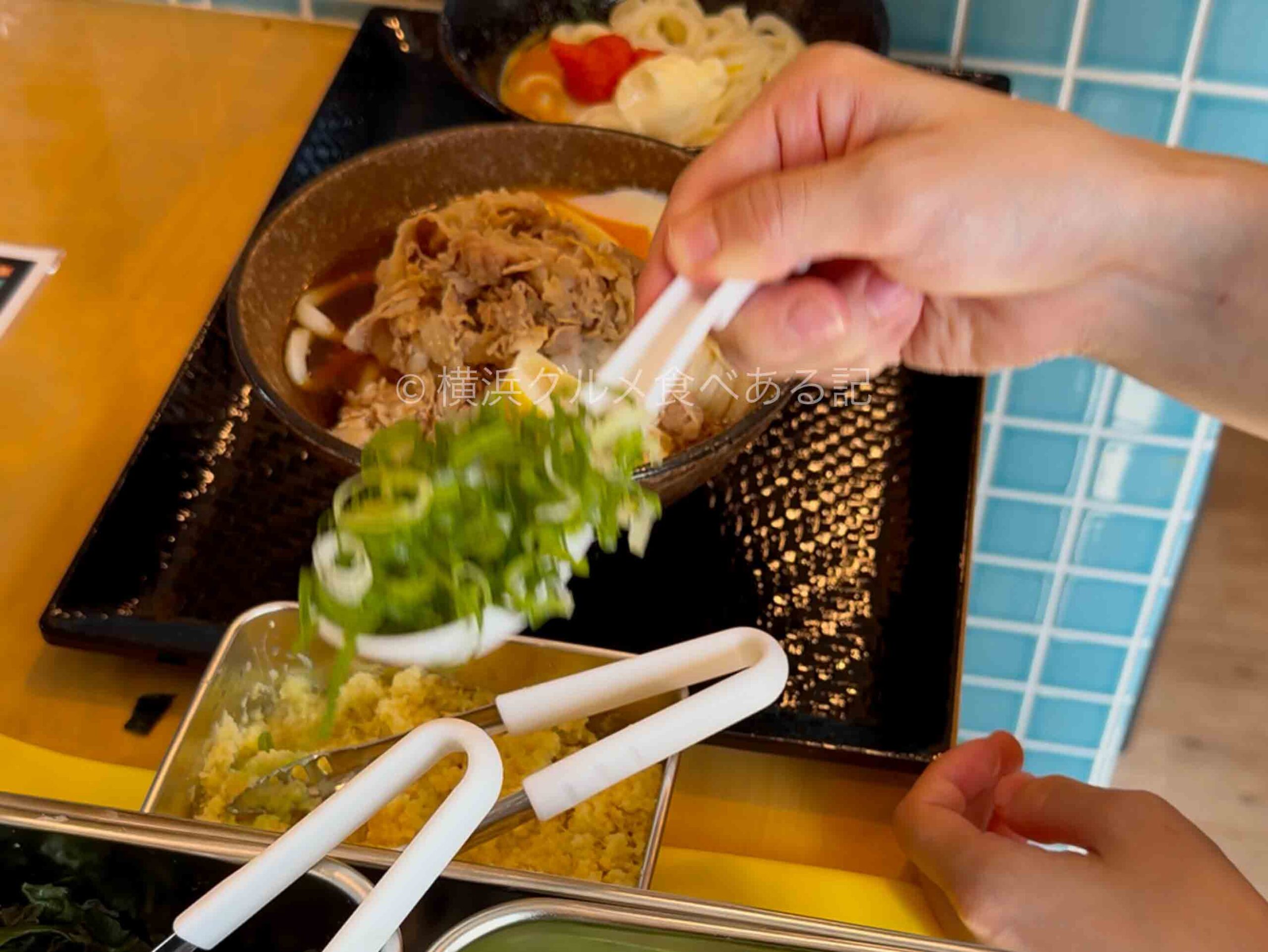 ネギやわかめなどは受け取り時に盛り付けて、席には天かすが用意されてました。