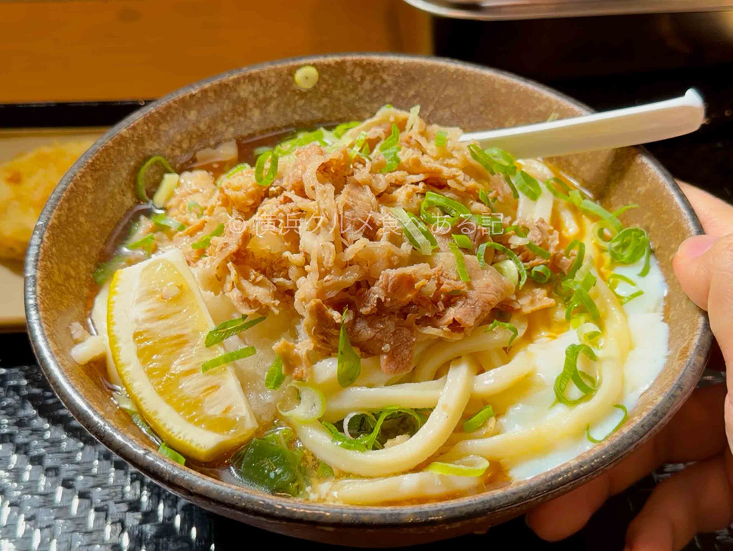 肉温玉ぶっかけは、甘辛く煮た牛肉がたっぷりのったボリューム満点の一杯。